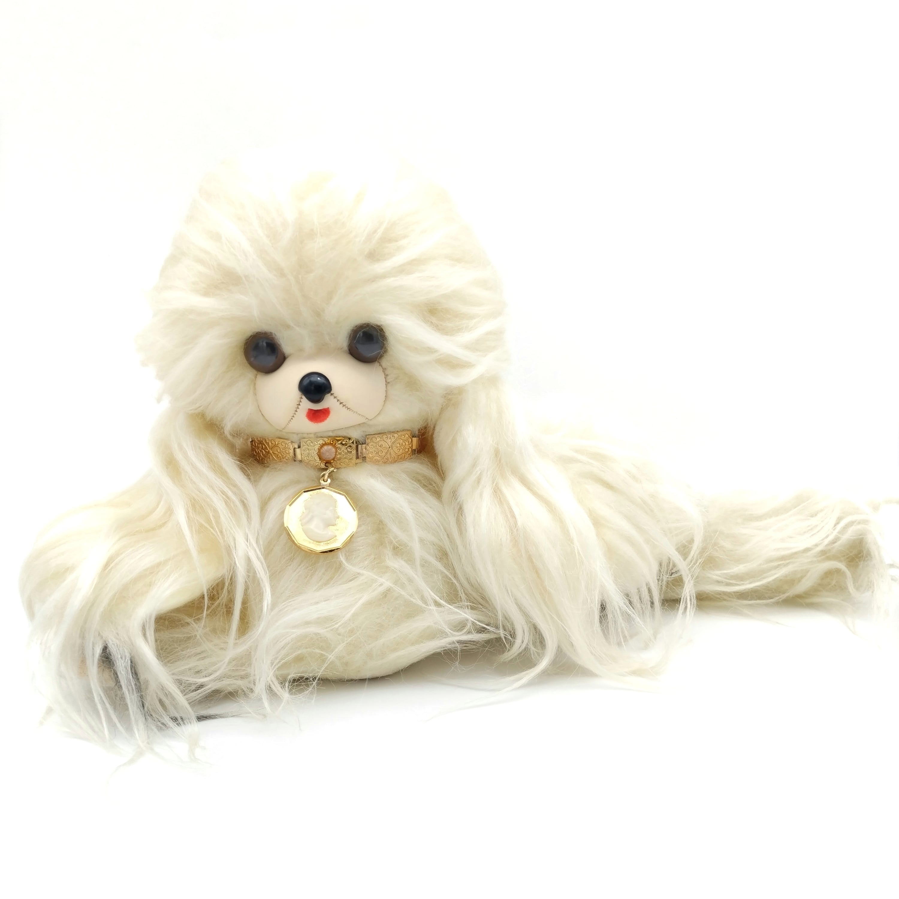 昭和の時代に子どもたちの心をときめかせた「お手入れワンちゃん」。長く豊かな毛並みと上品なゴールドのカメオのついた首輪、そして心を奪われるような優雅で愛らしい表情をしている犬のぬいぐるみです。