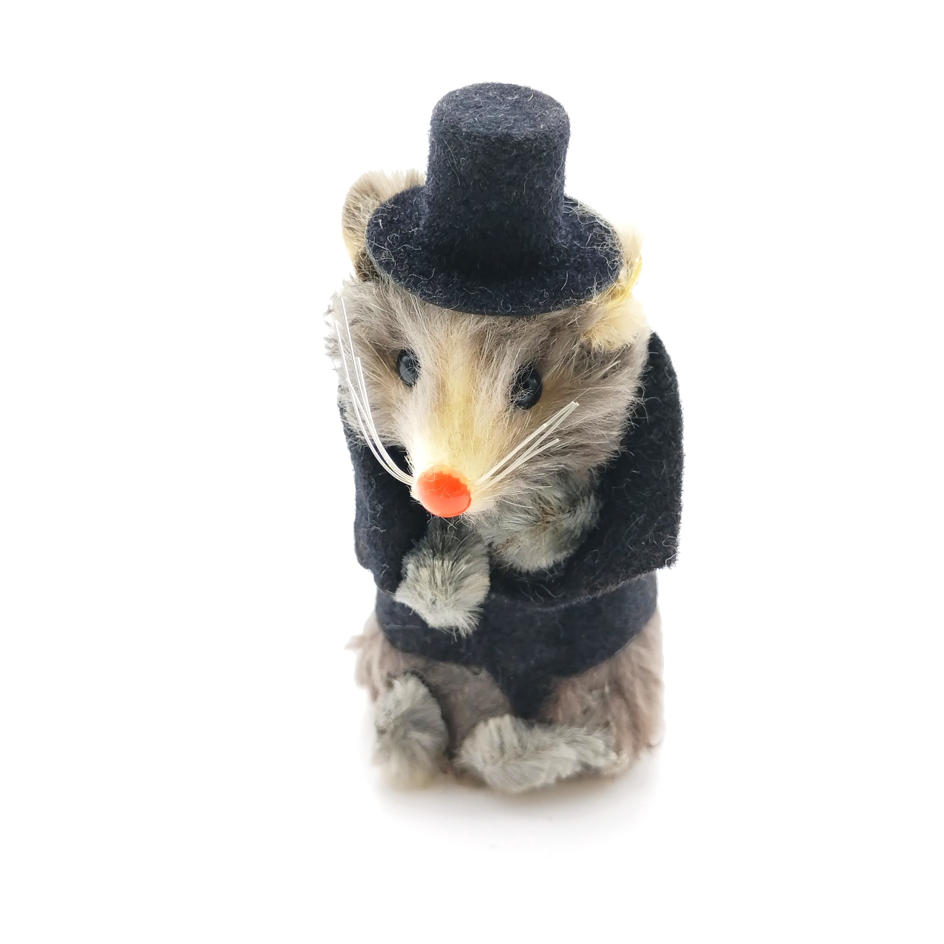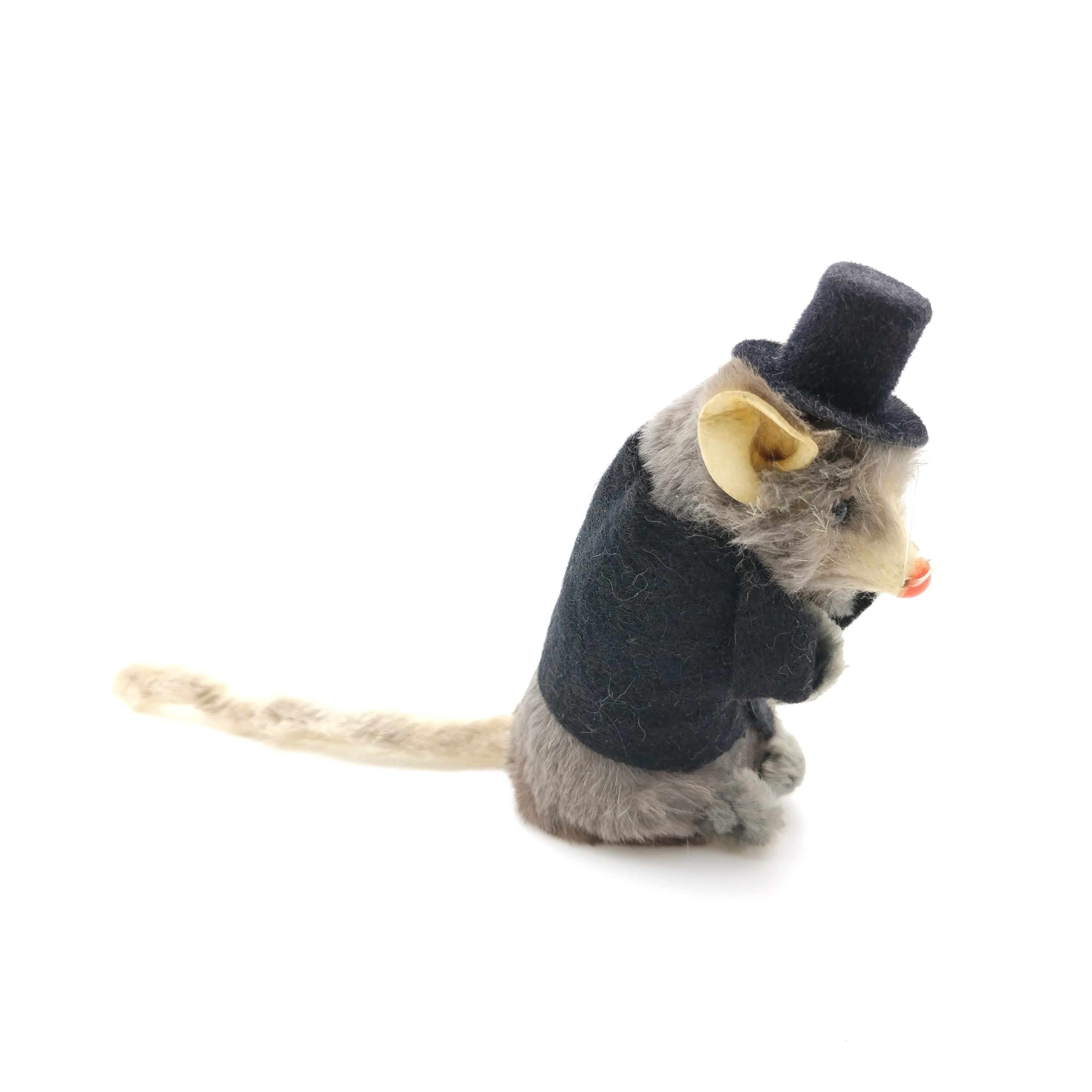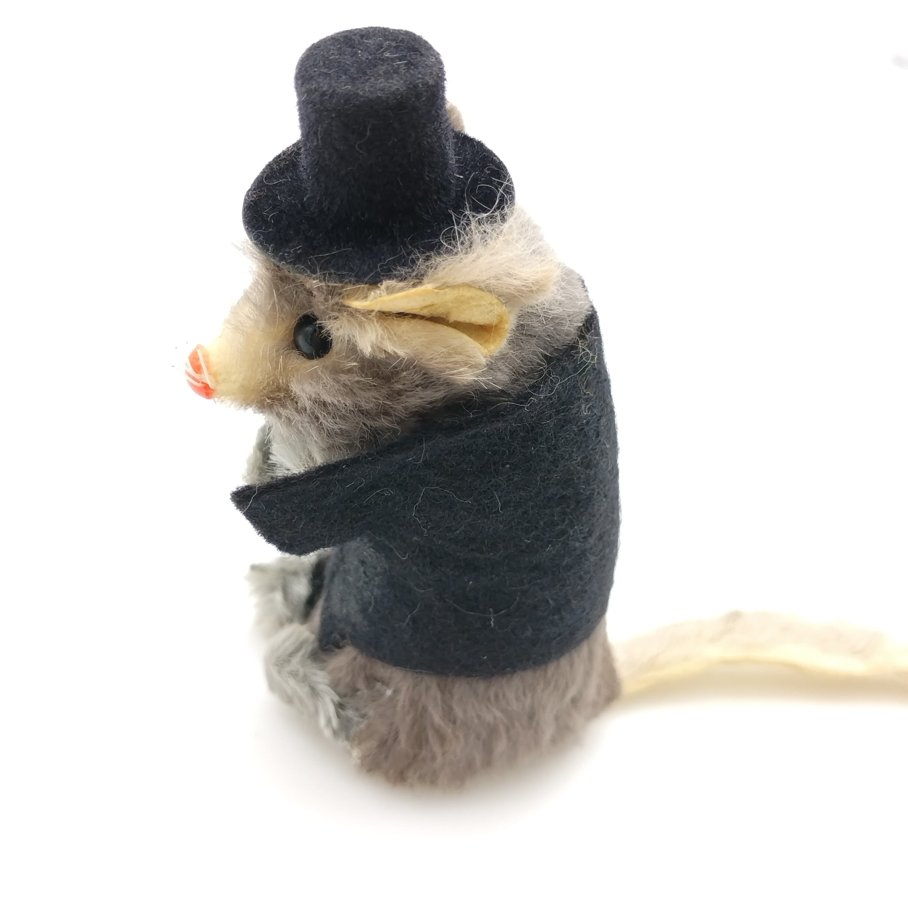 西ドイツのkarl schrickel社製のリアルファーを使ったネズミです。シルクハットをかぶっていて格好つけているはずが猫背で姿勢が悪いところがまた愛らしいです。