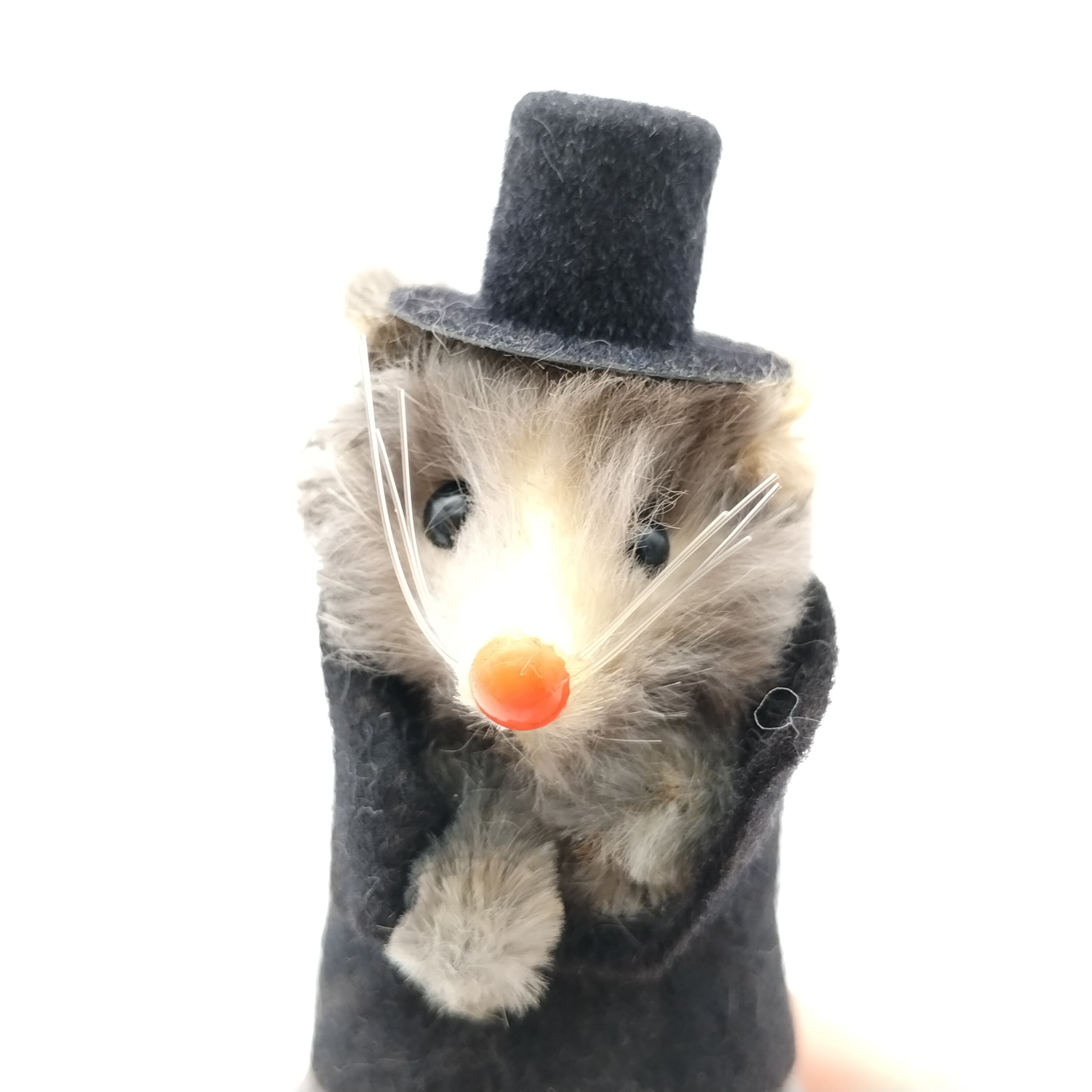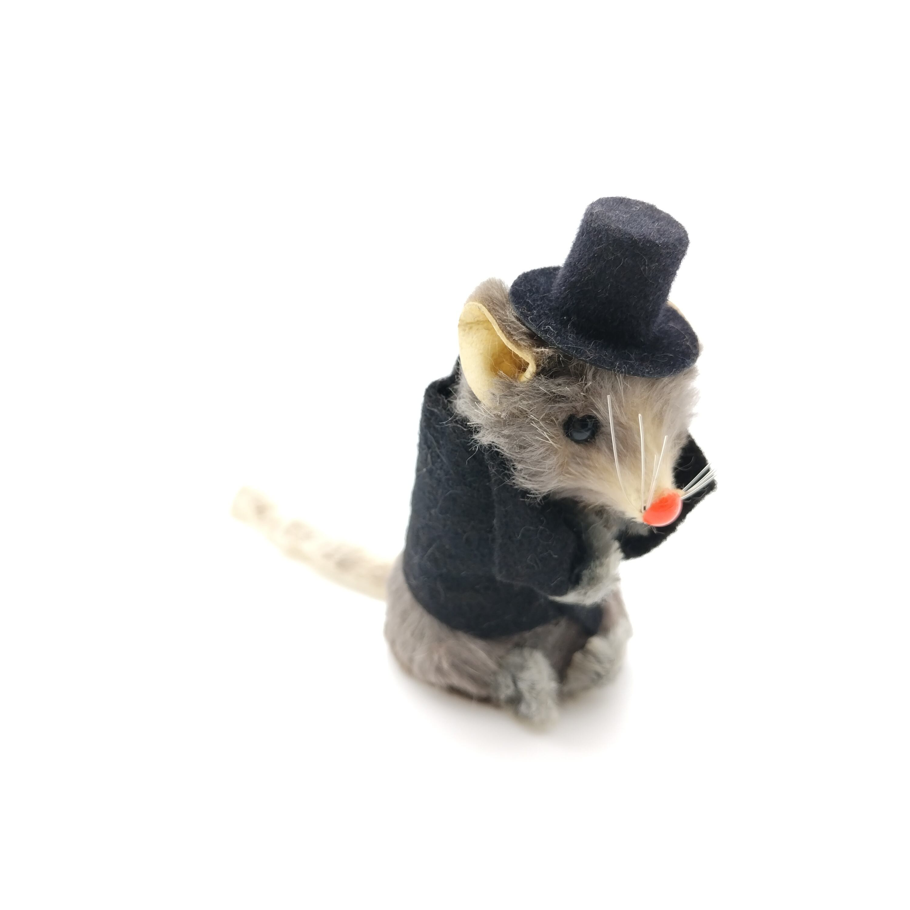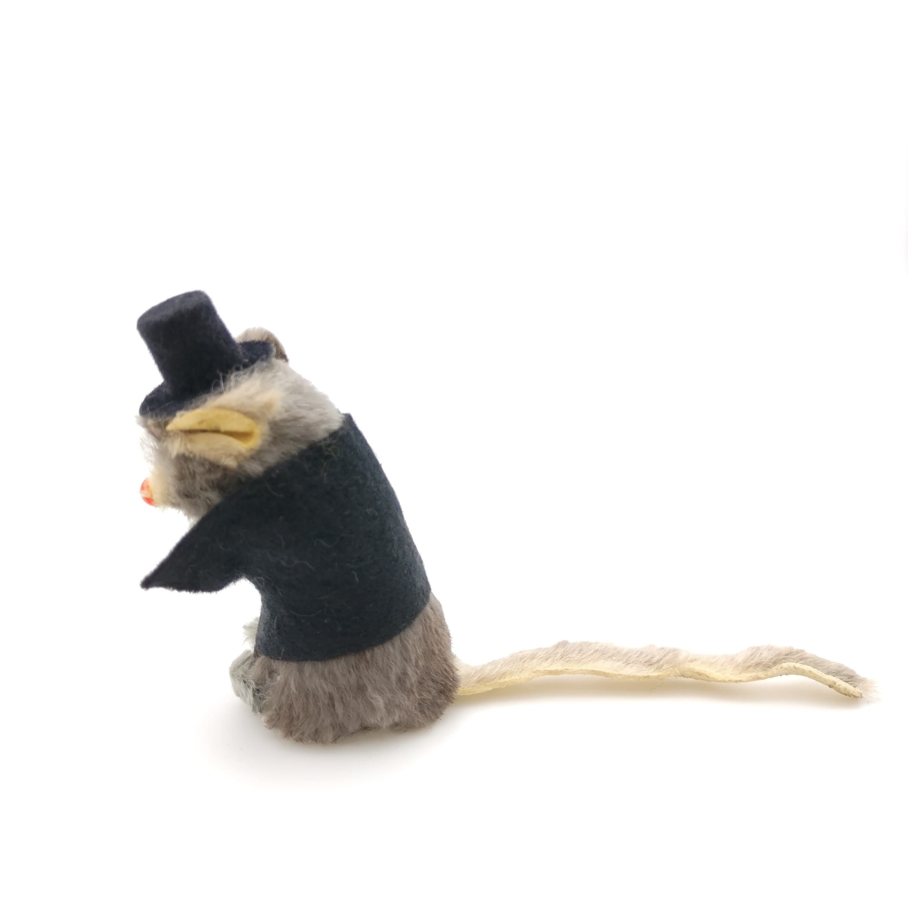 西ドイツのkarl schrickel社製のリアルファーを使ったネズミです。シルクハットをかぶっていて格好つけているはずが猫背で姿勢が悪いところがまた愛らしいです。