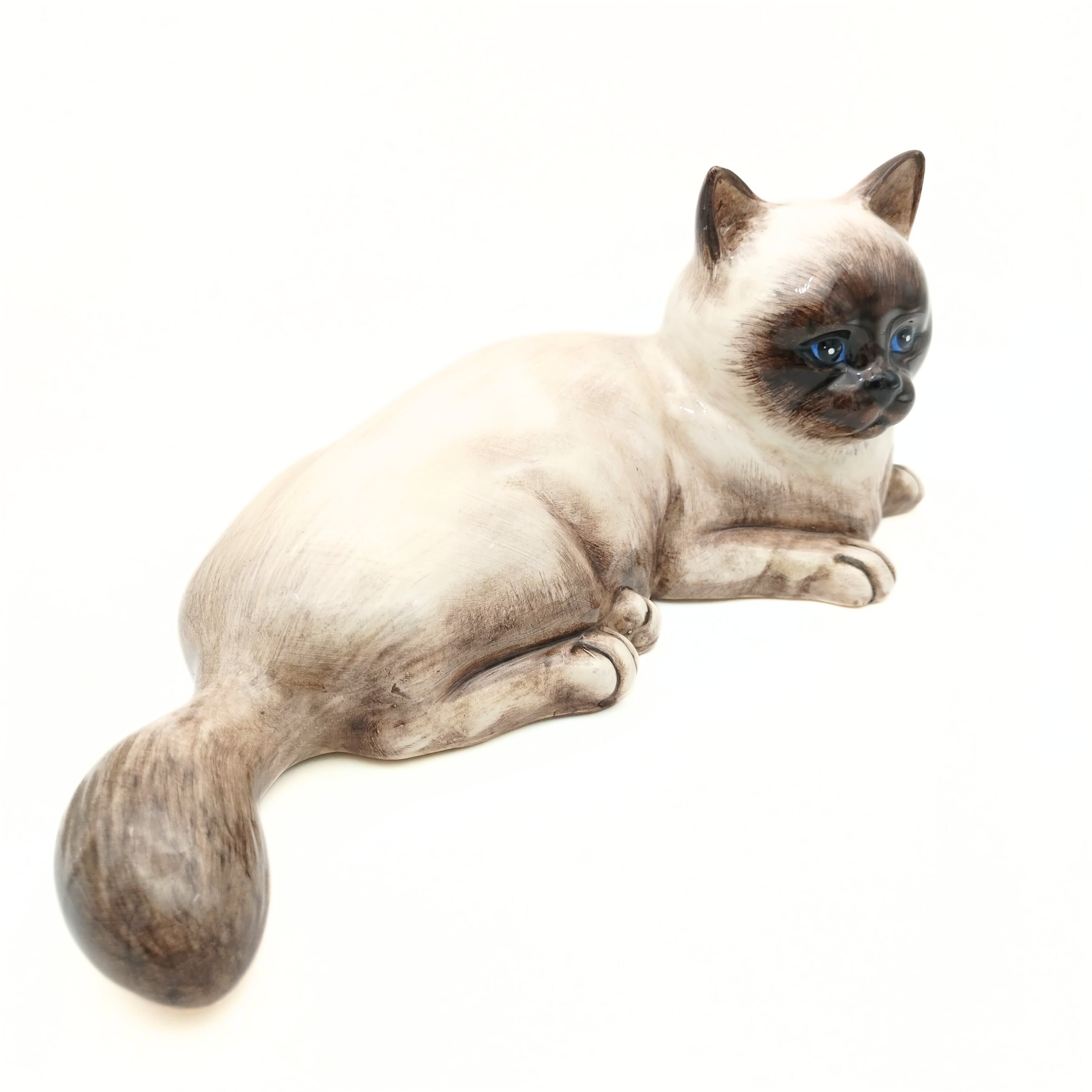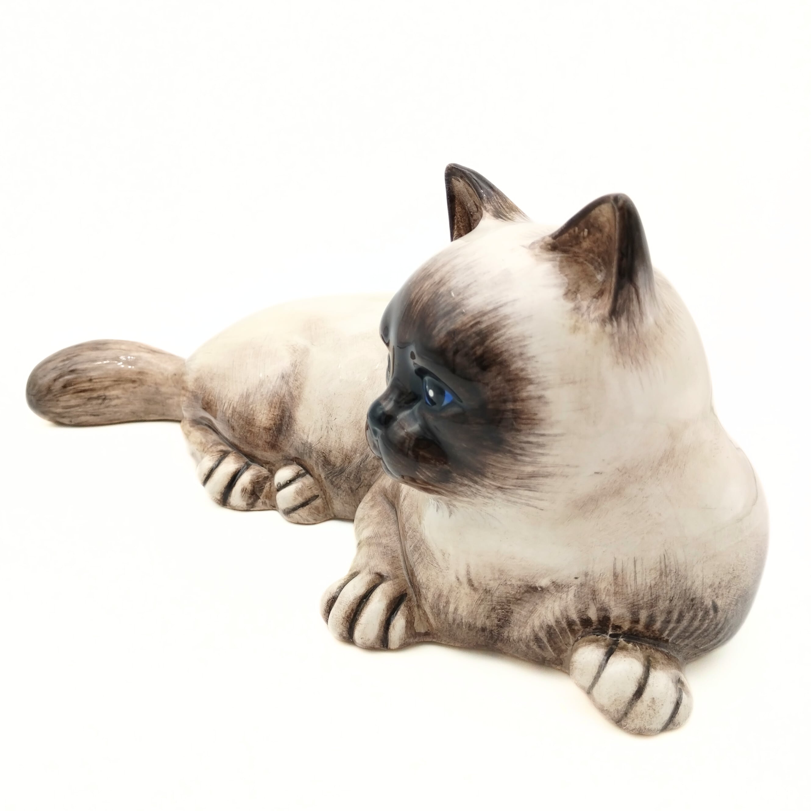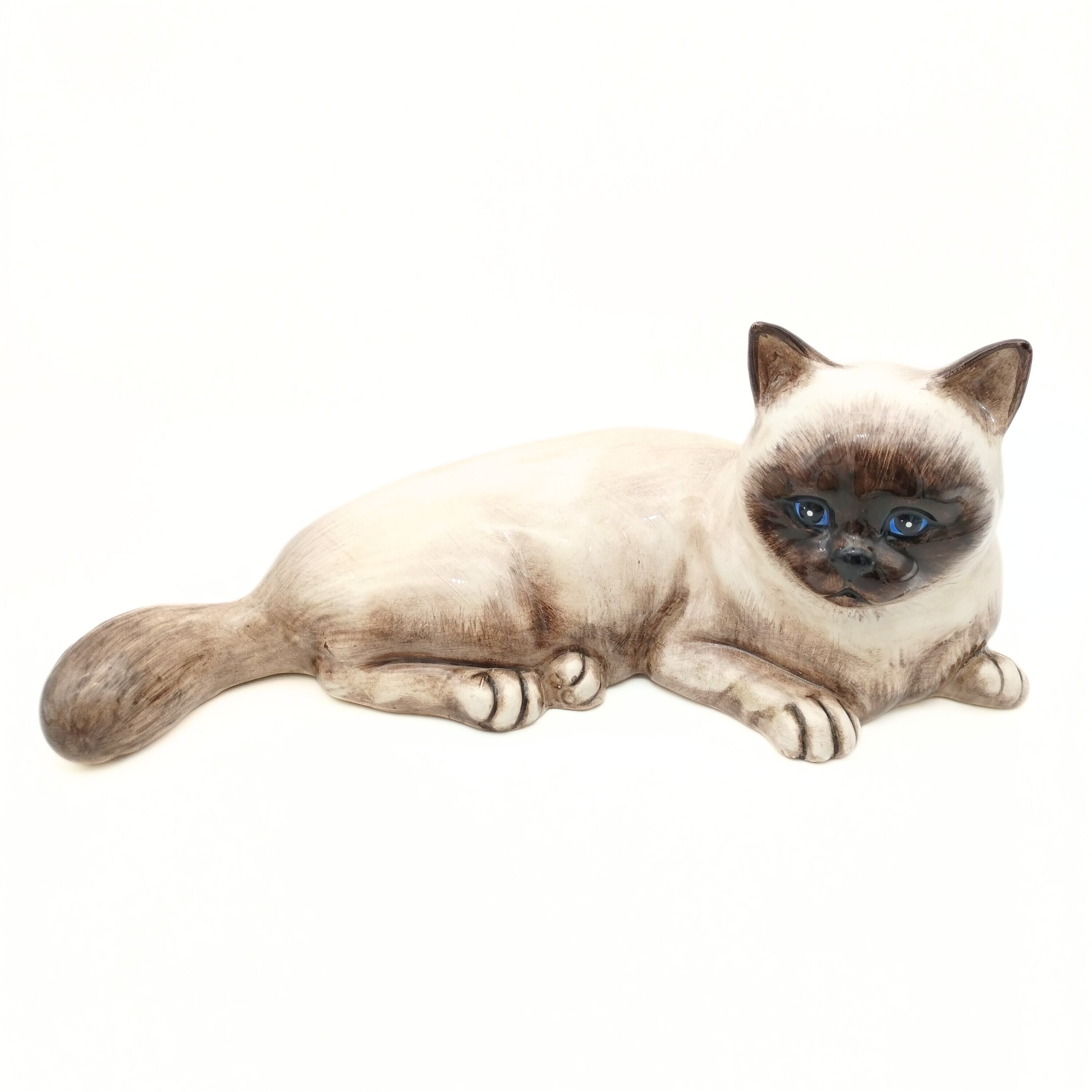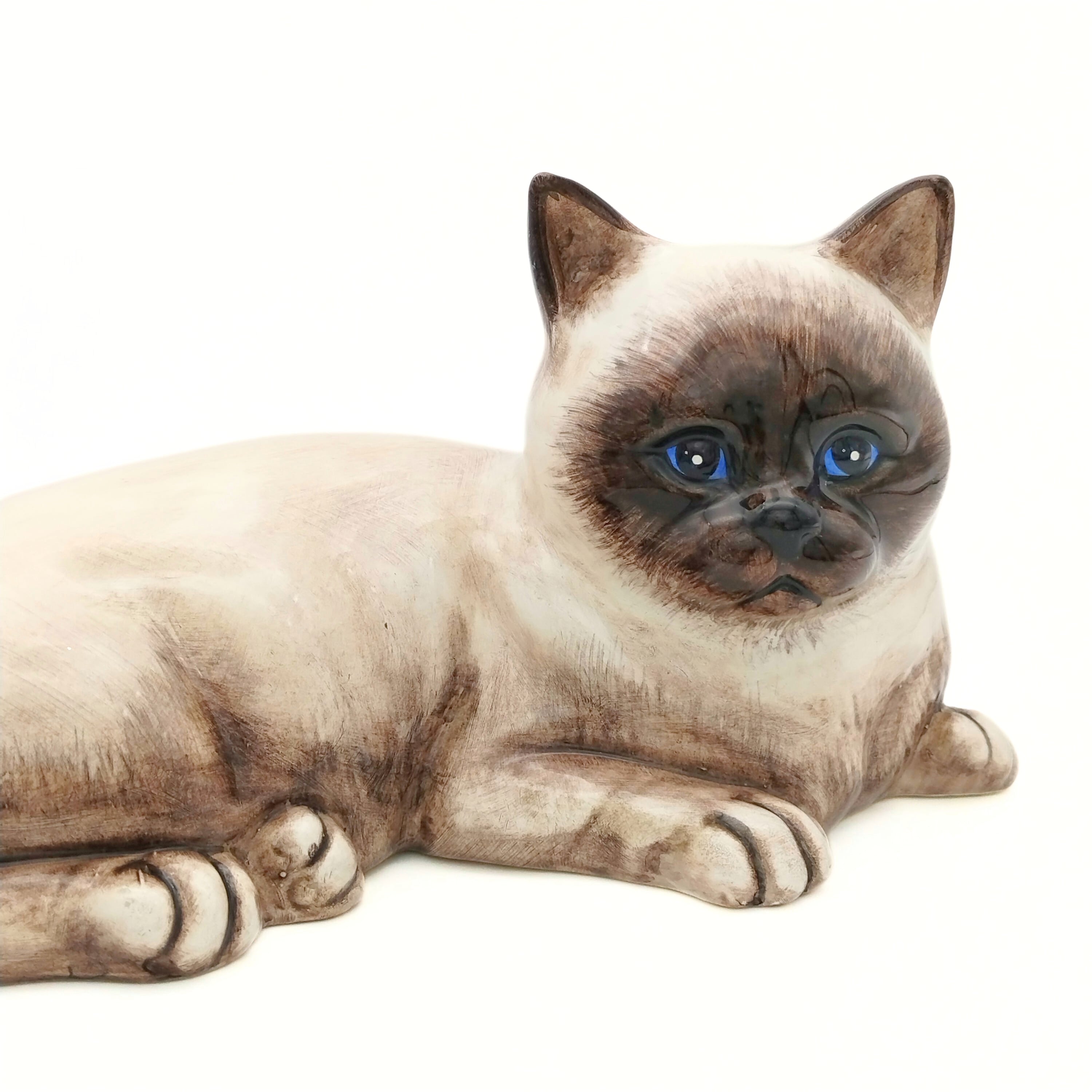 優しいお顔のシャム猫さんです。猫の置物としてはすこし大きめサイズですので、もしかしたらモデルとなった実物の猫もいたかもしれないですね。ぜひ名前をつけて可愛がっていただけたらと思います。