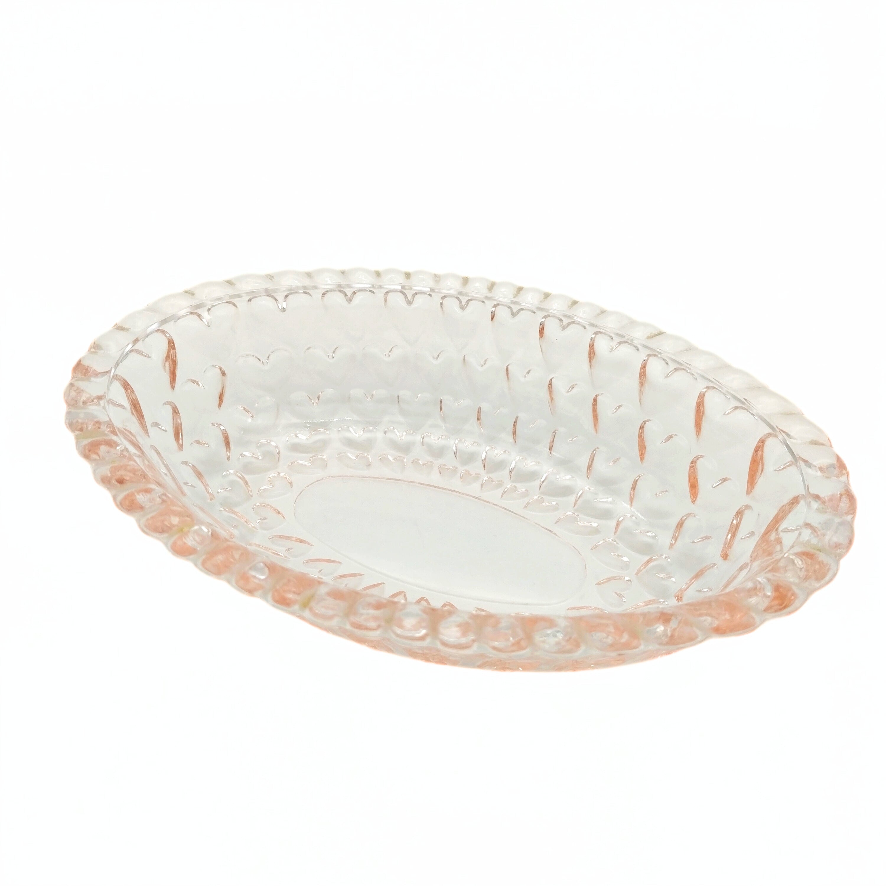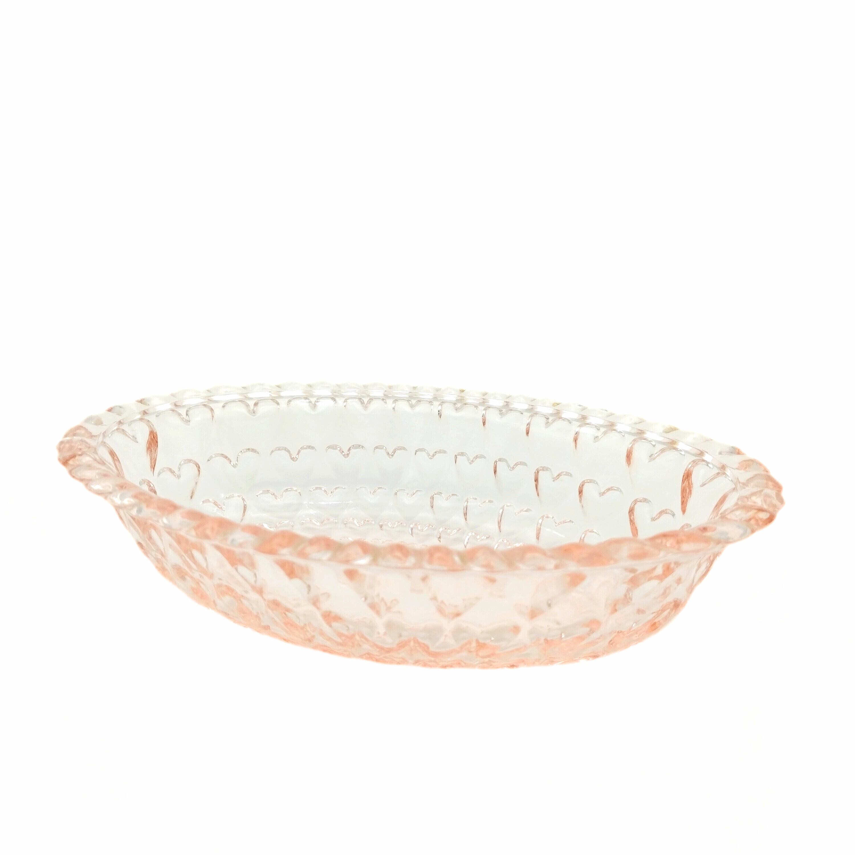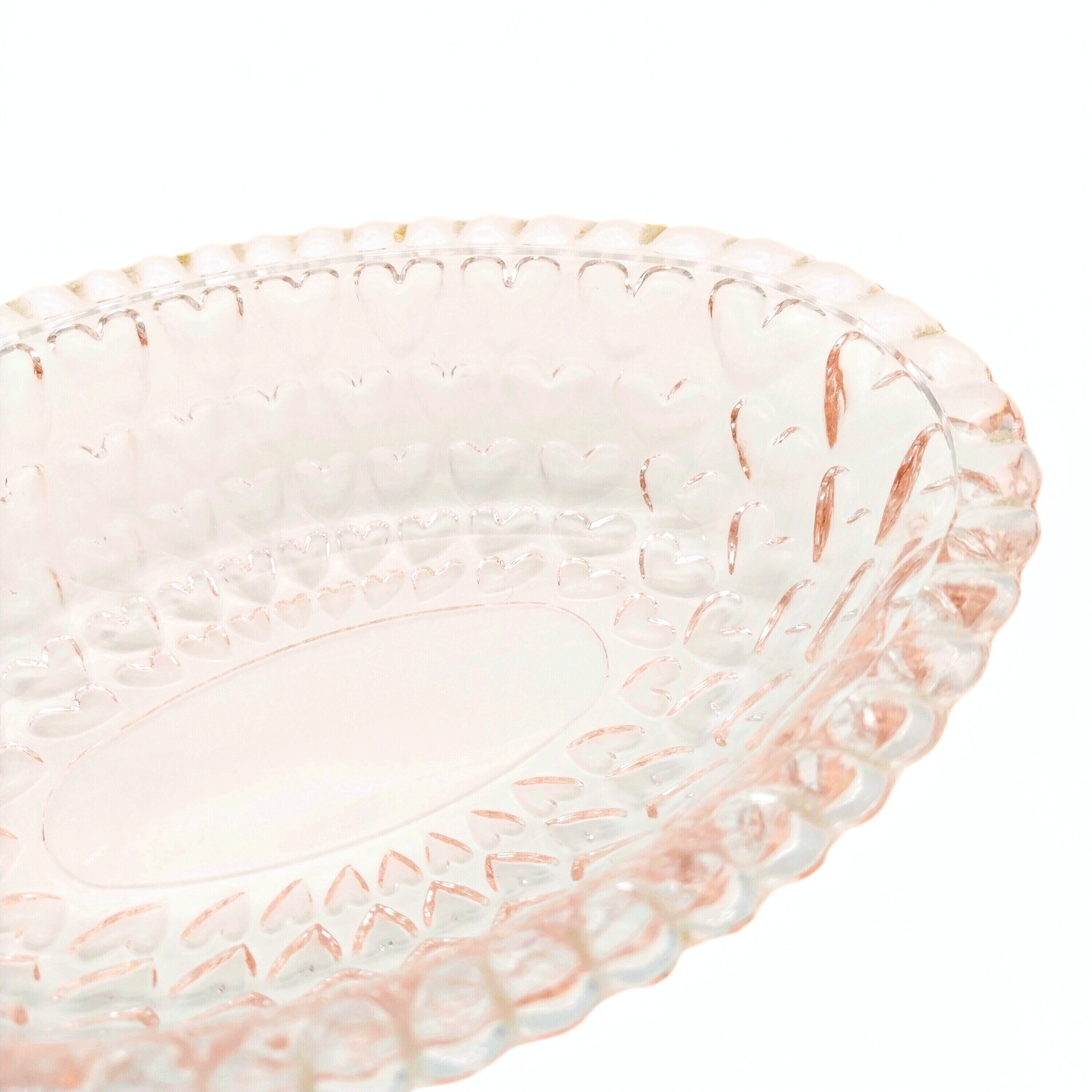 ノスタルジックな淡いピンク色のハートがたくさん施されたオーバル型のガラスの器です。