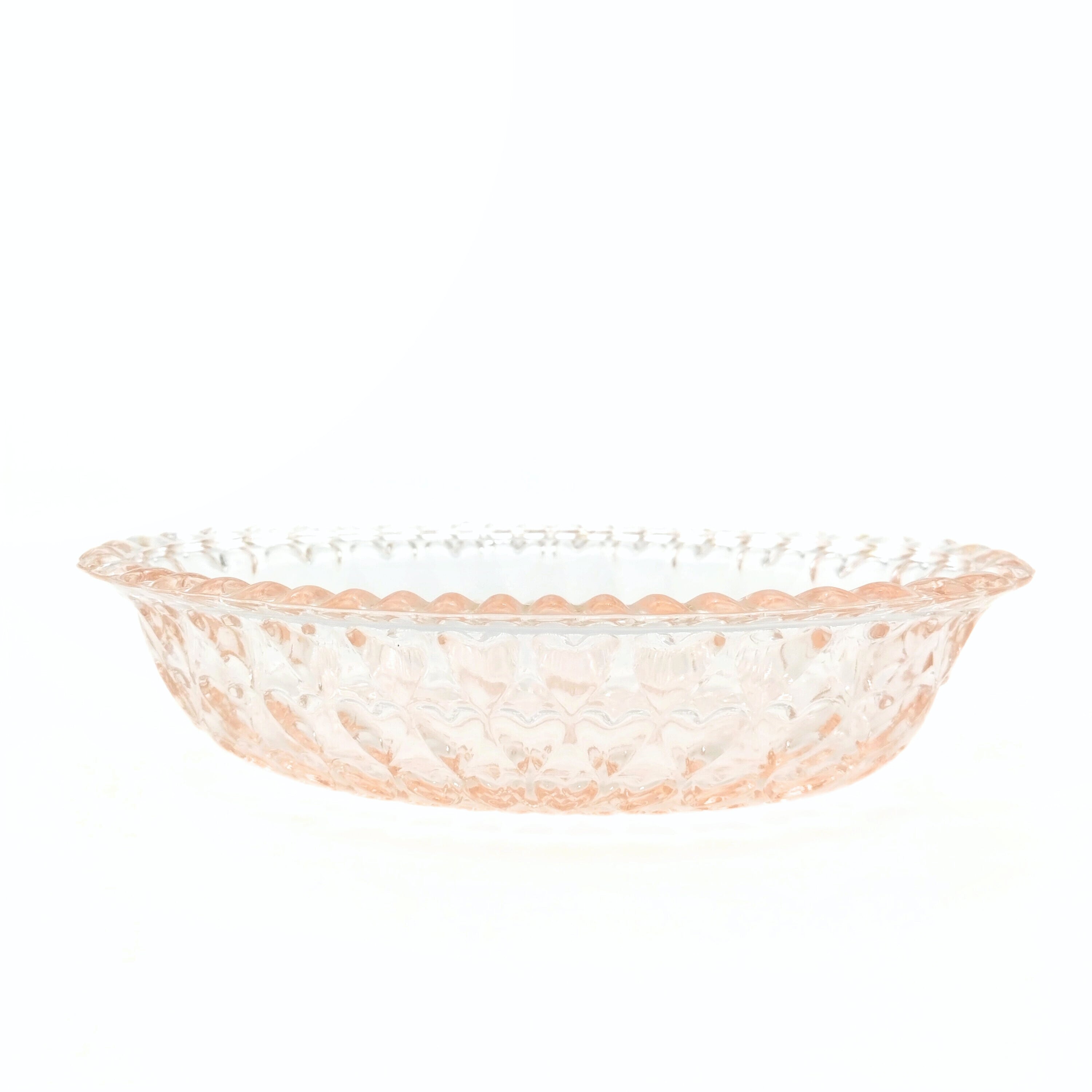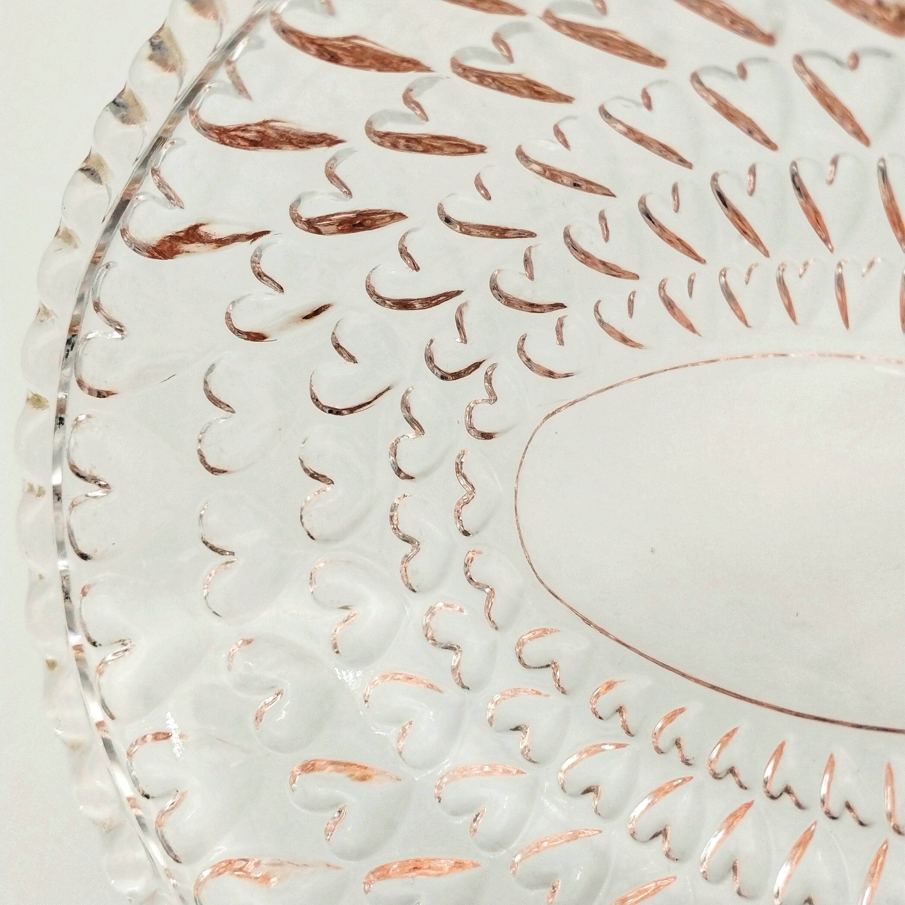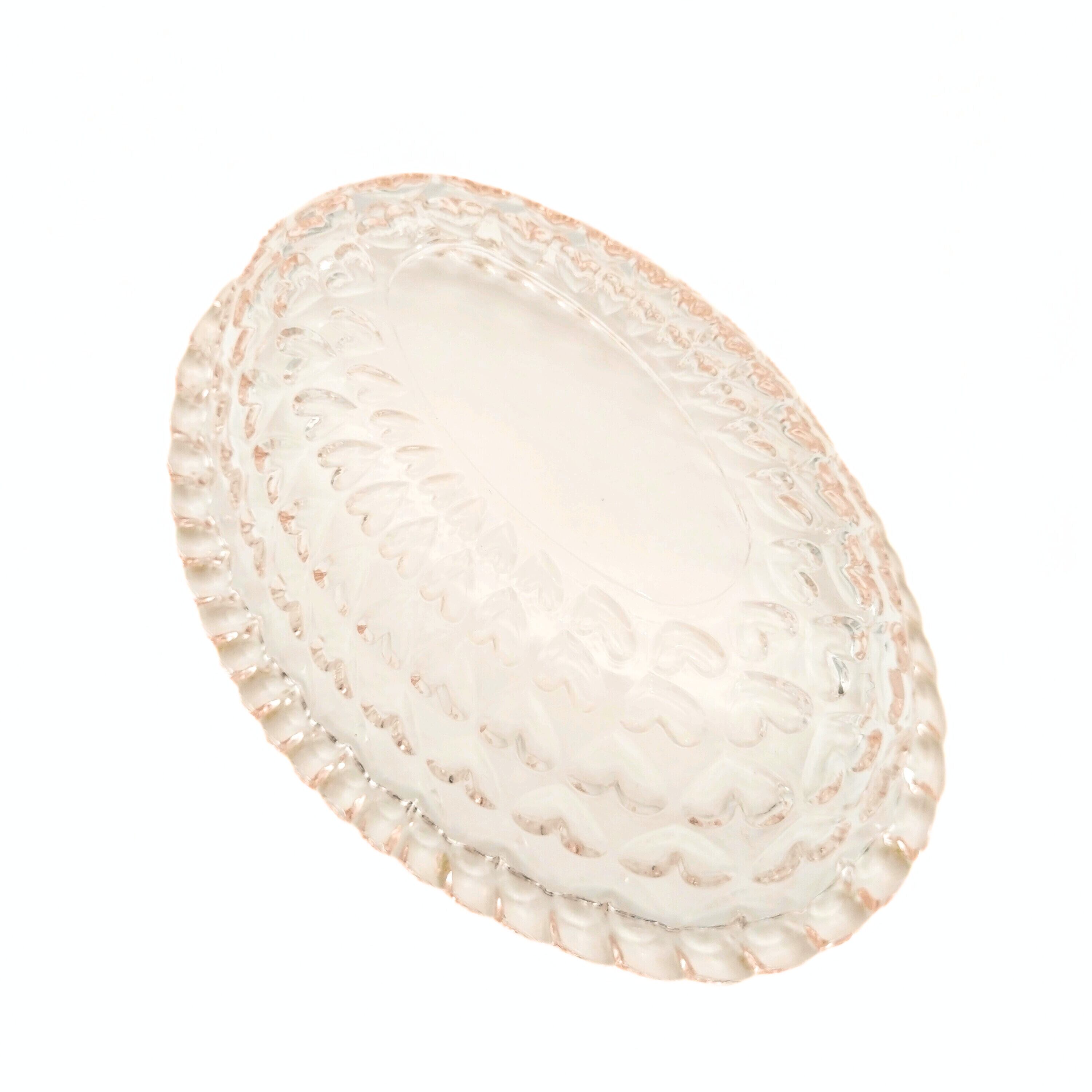 ノスタルジックな淡いピンク色のハートがたくさん施されたオーバル型のガラスの器です。