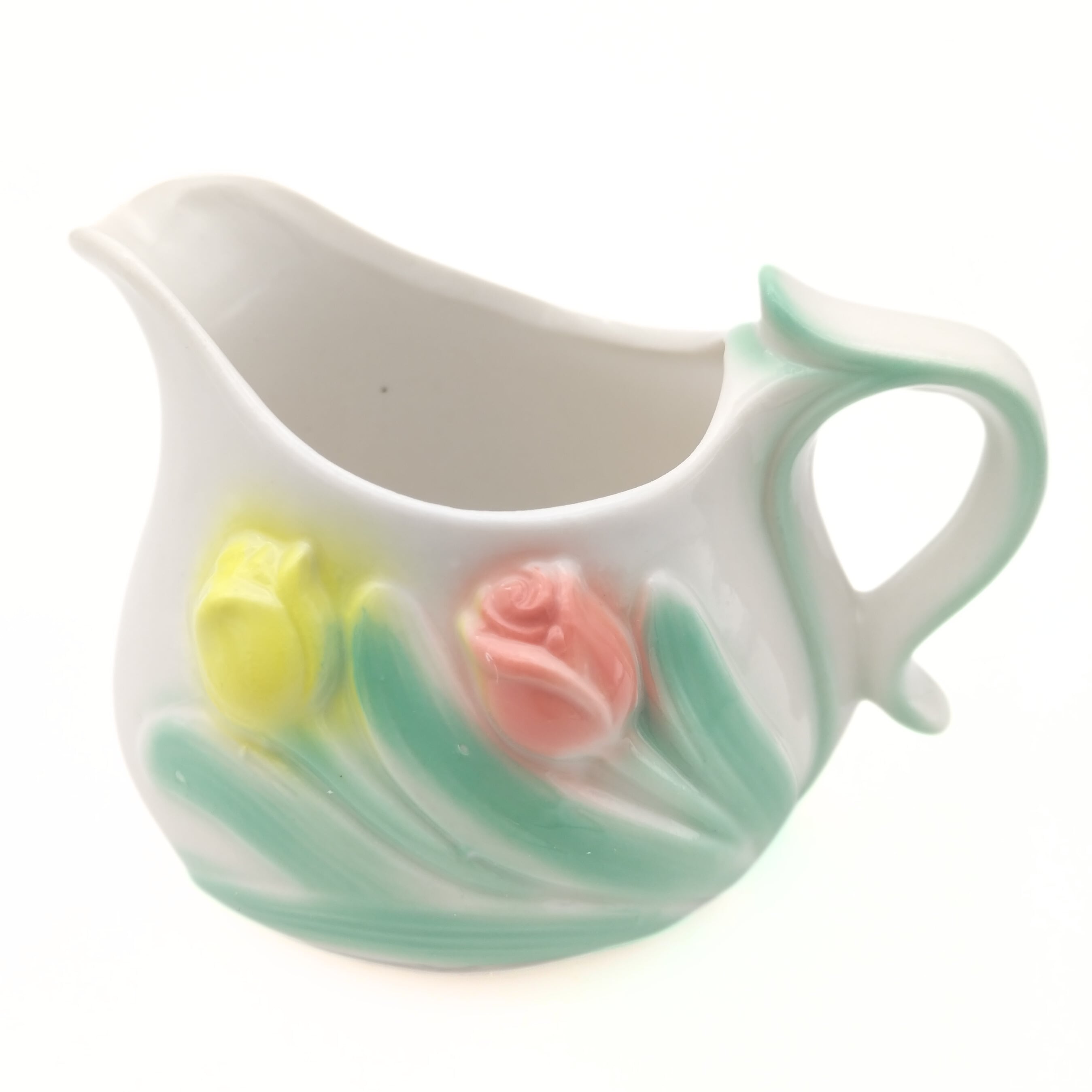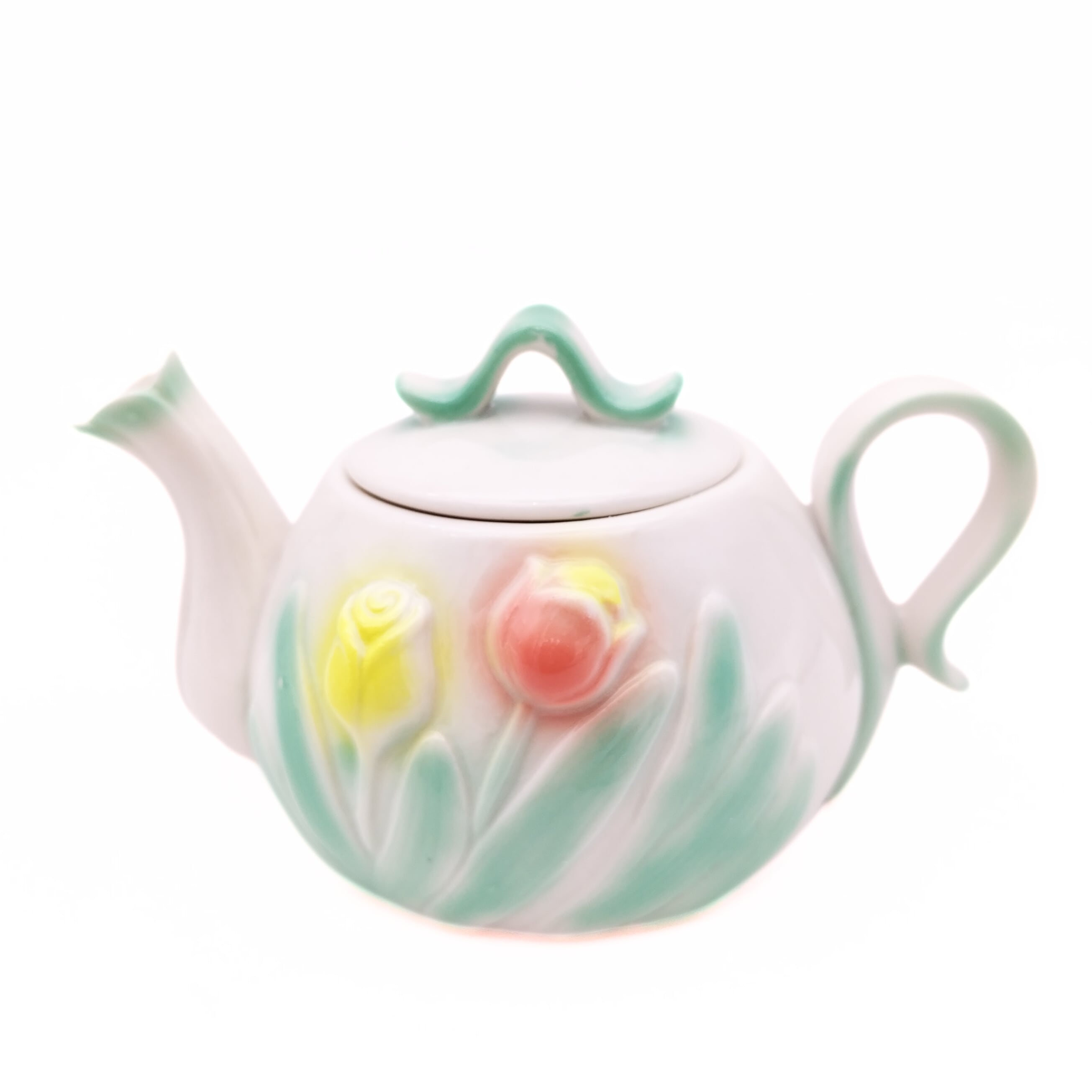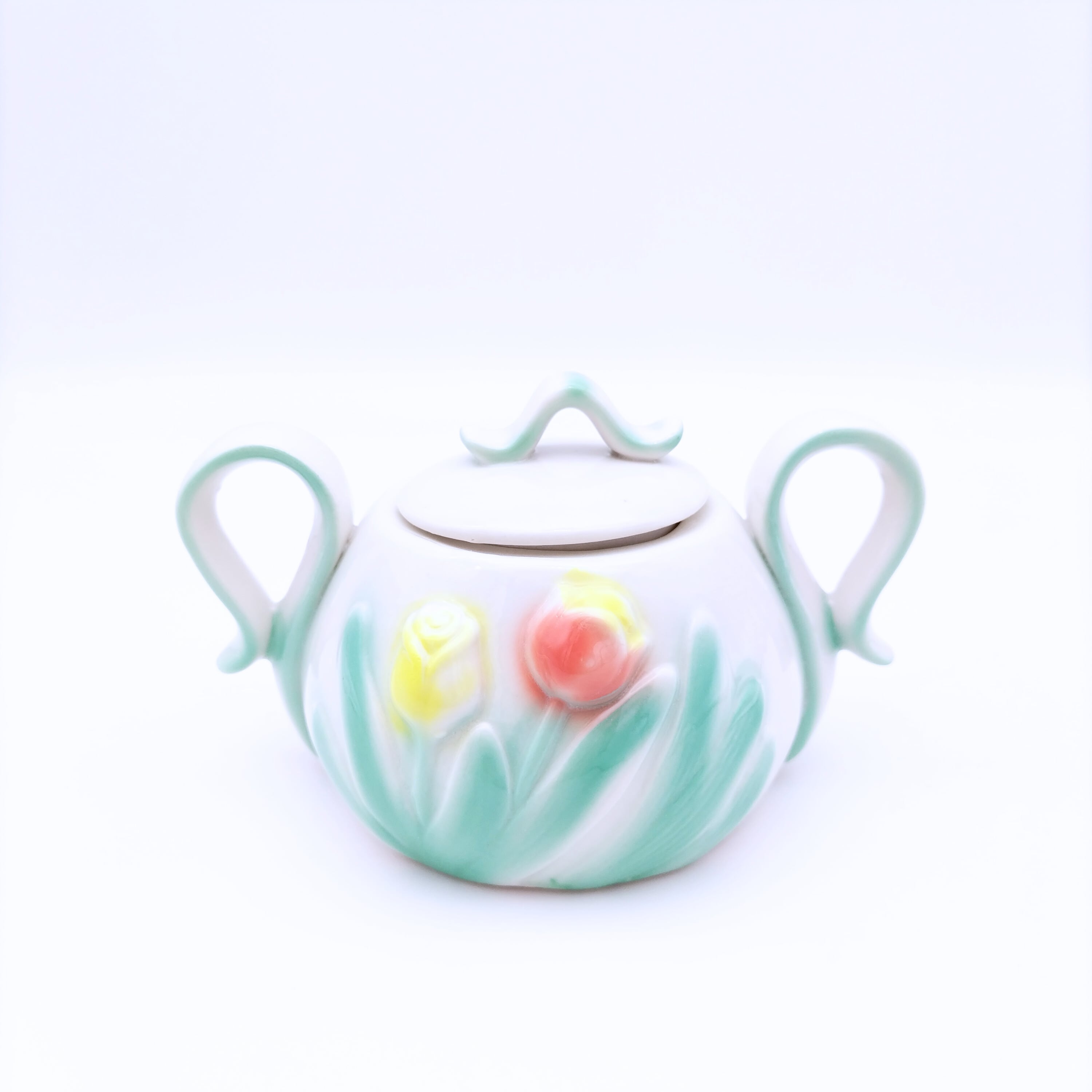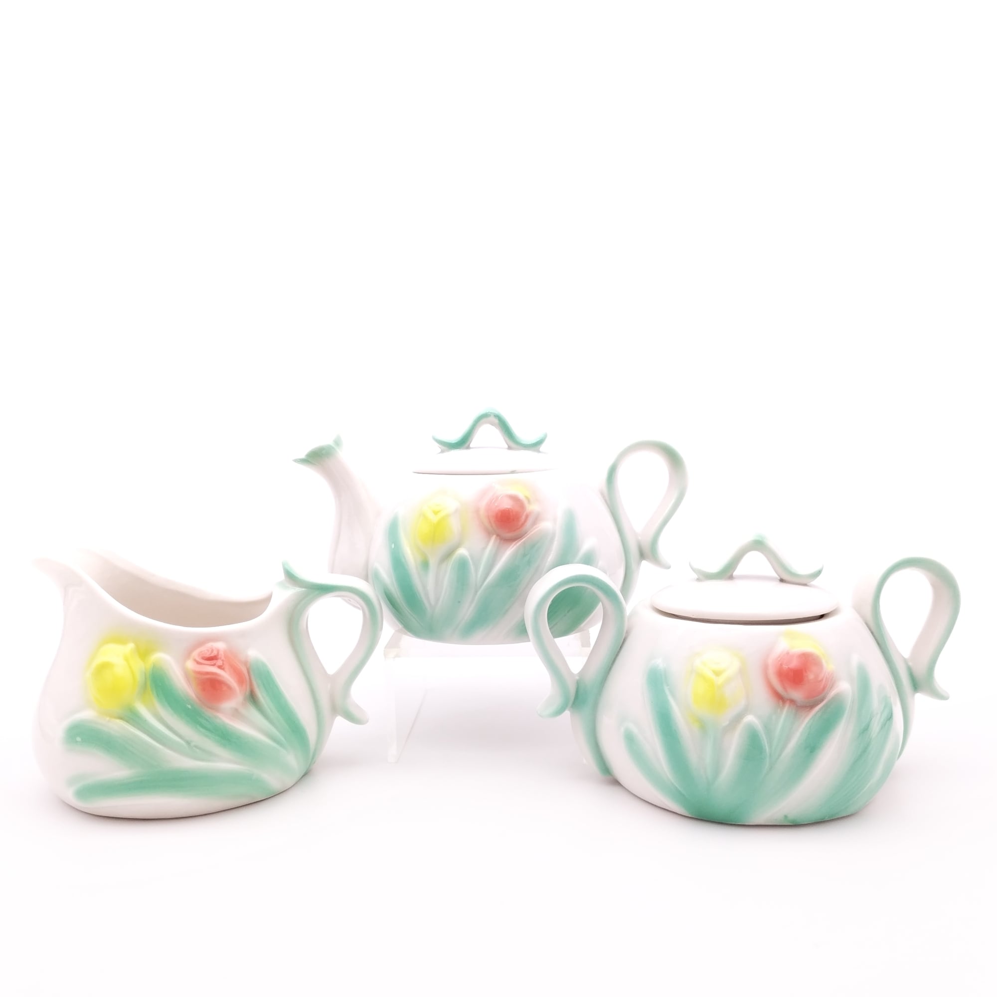 春らしい優しい色合いのチューリップがほどこされた陶器のティーポット、シュガーポット、クリーマーの3点セットです。