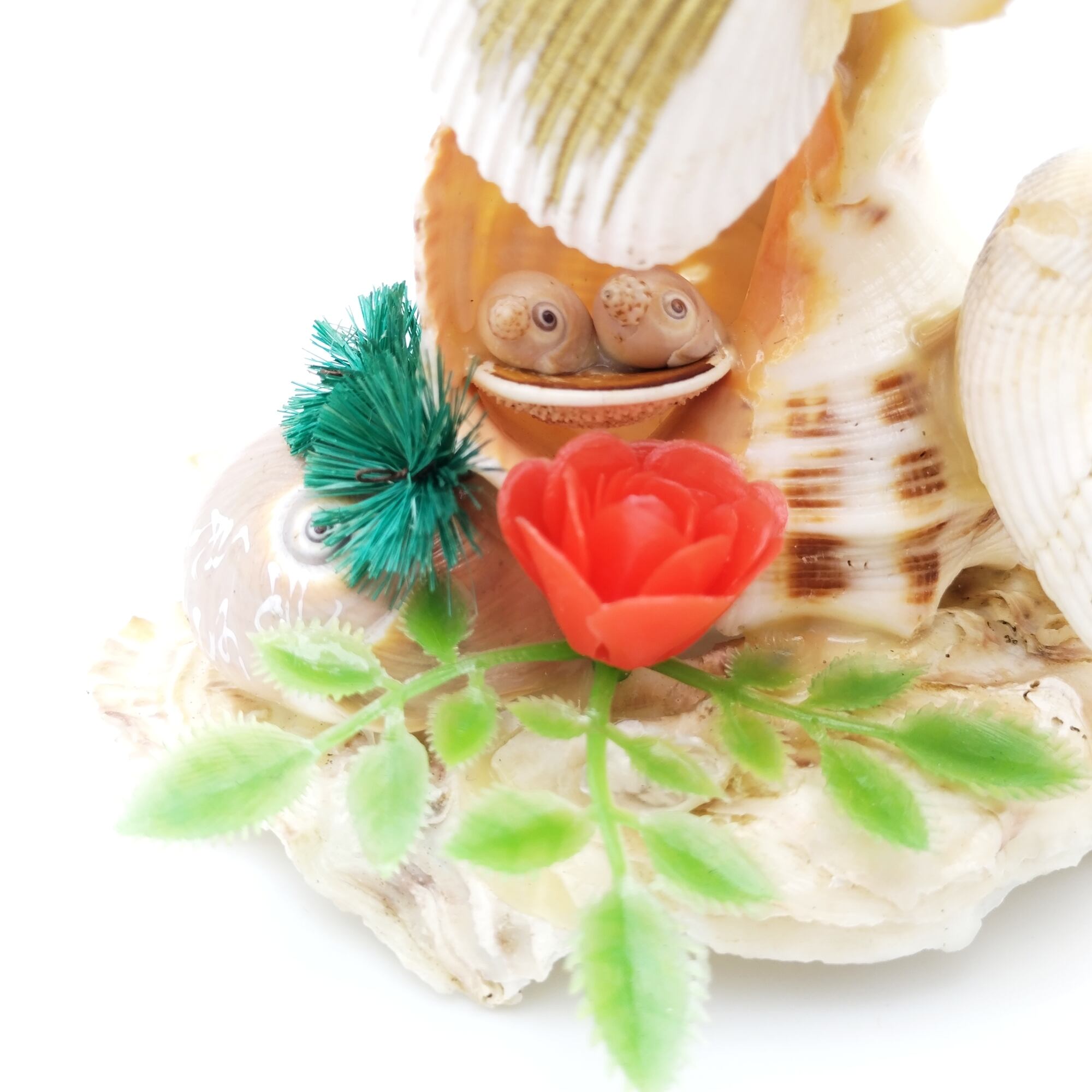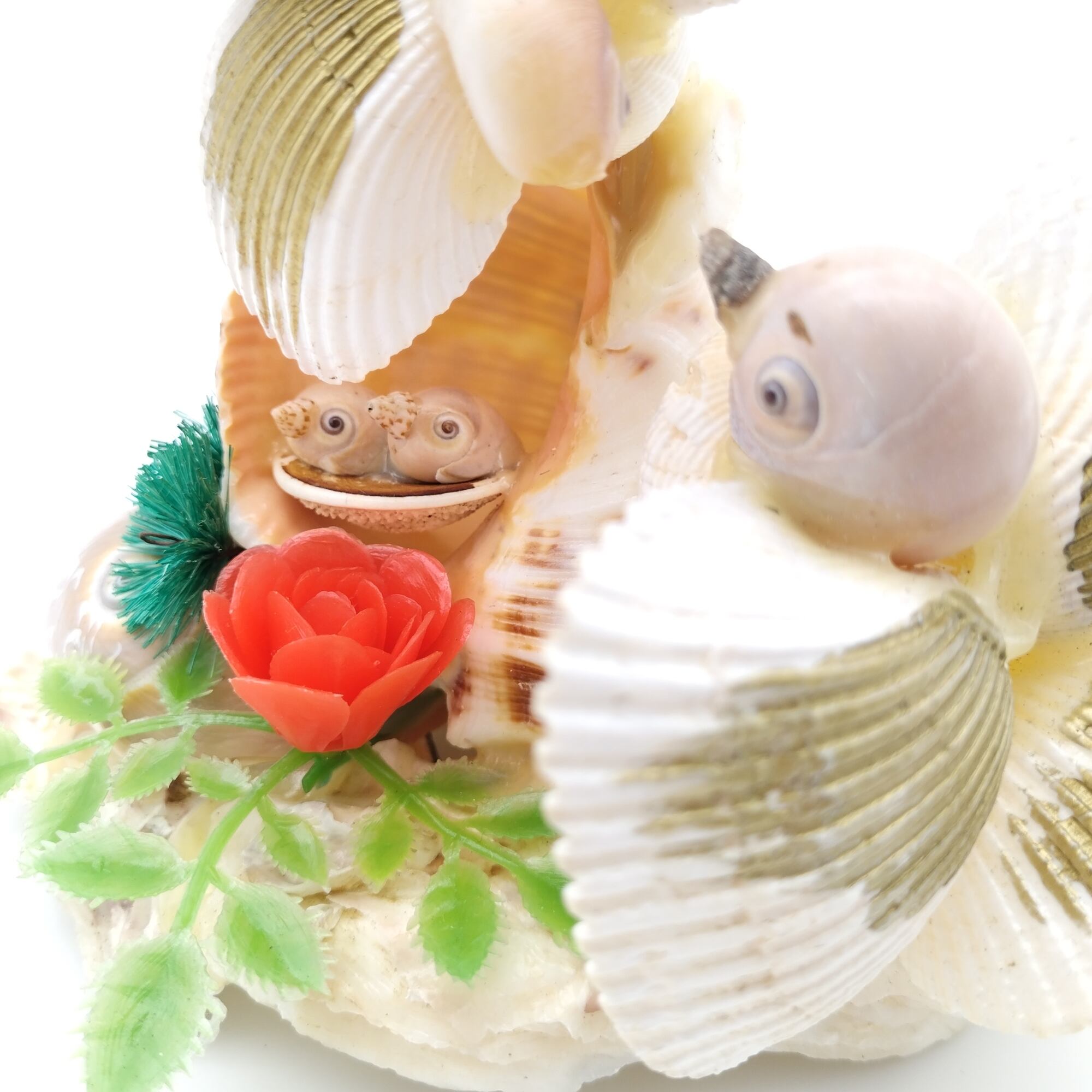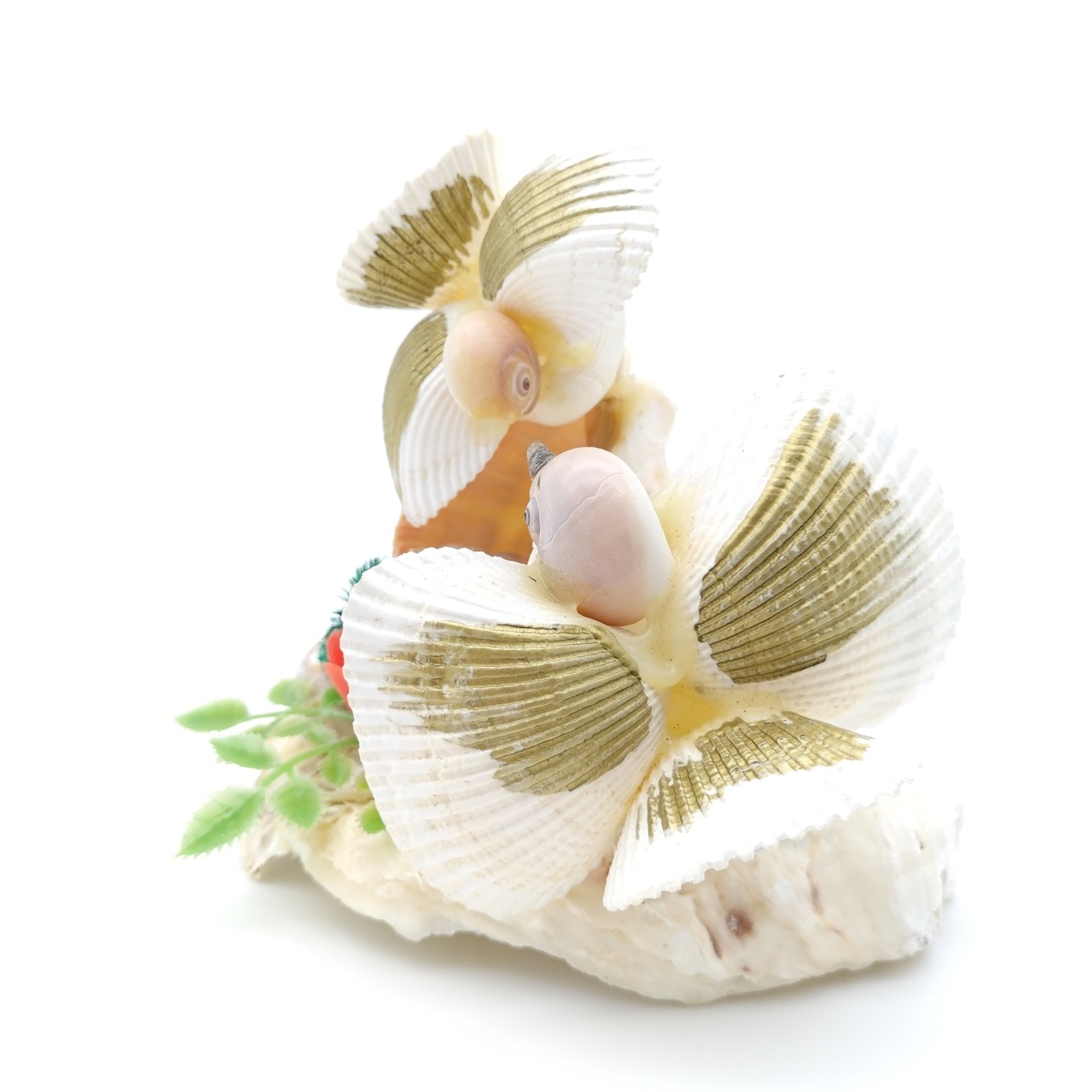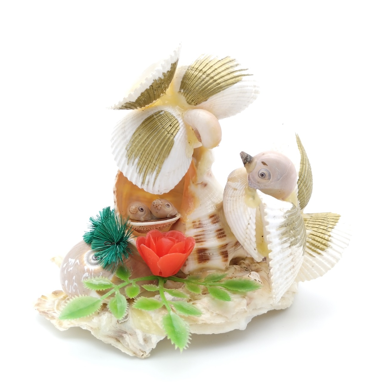 レトロな貝細工の鳥家族です。昔のお土産品などで貝を使って表現されているものは様々ありますが、鳥の赤ちゃんまで!細部にもこだわりを感じる素敵なオブジェです。