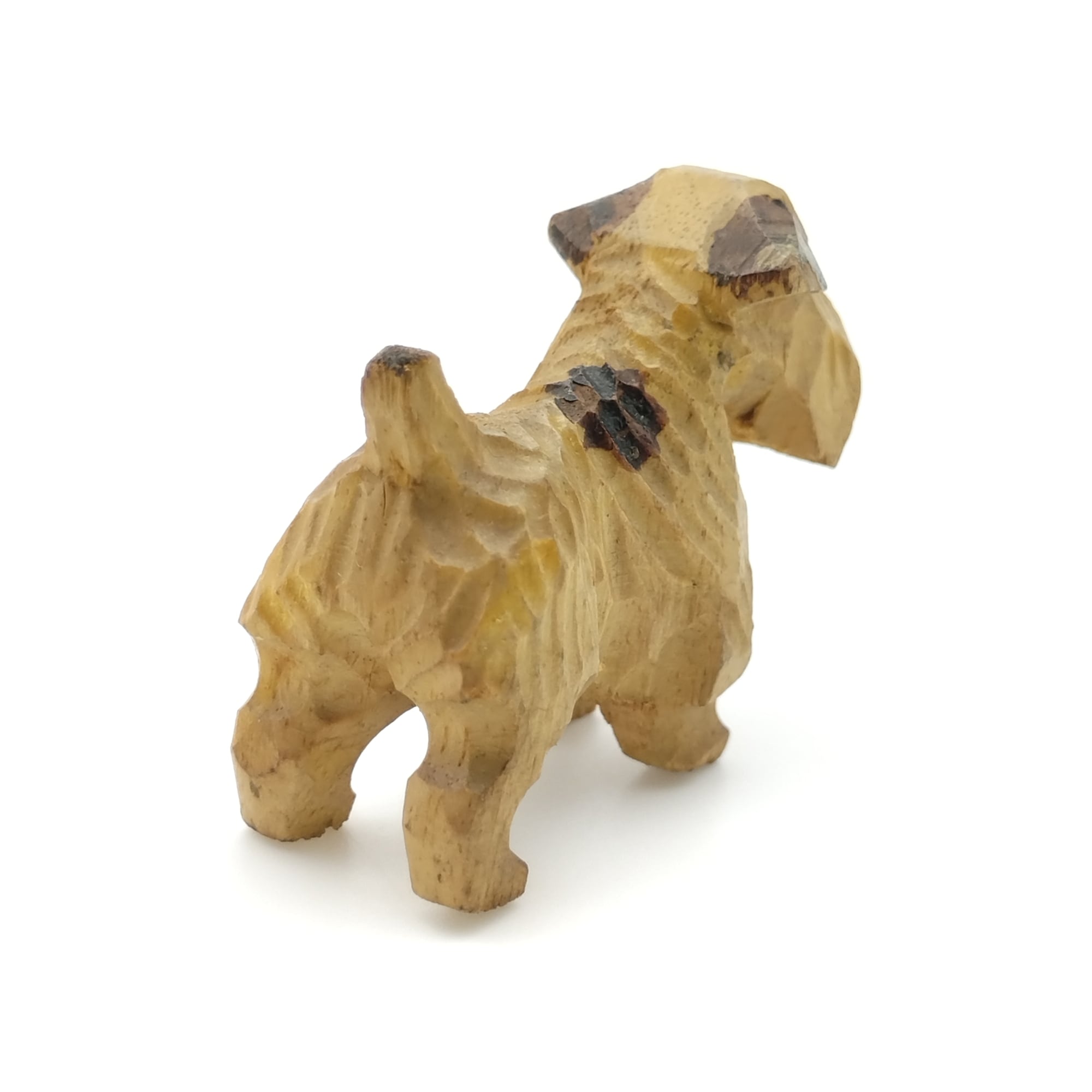 耳が前に折れている造形になっており少しずんぐりむっくりとした体形ですがテリアの王様と呼ばれるエアデール・テリアのような特徴をもつ木彫り犬です。ガラス玉のつぶらな瞳で可愛らしい表情をしています。