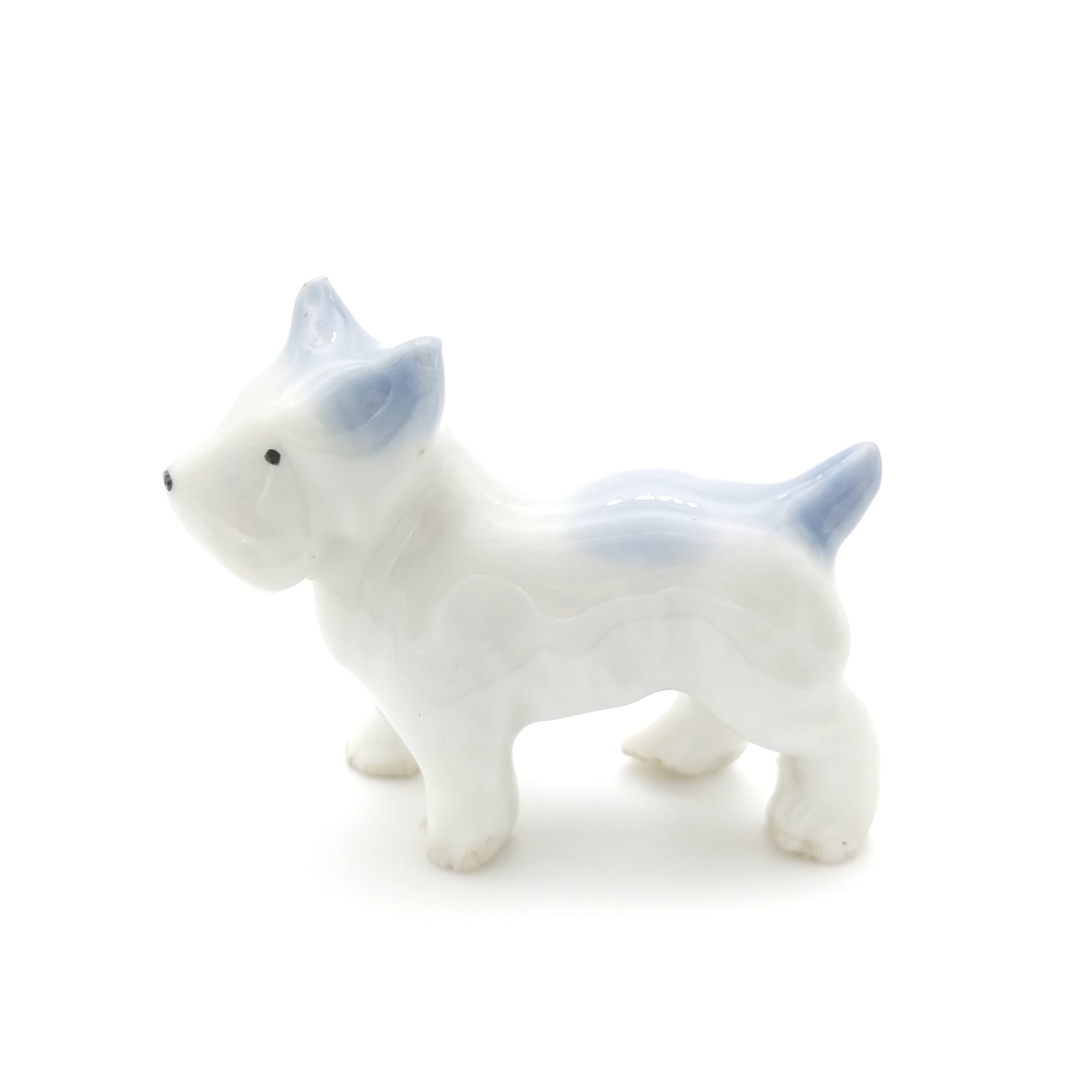 足が短く体ががっしりどっしりとした体格の犬のフィギュリンです。耳と背中、尻尾に淡い青色の塗料を吹き付けた技法が使われており底面に「JAPAN」の文字があります。おそらく第2次世界大戦後の輸出全盛期当時に作られたものかと思われ、輸出用ノベルティらしい特徴をもつ一品です。