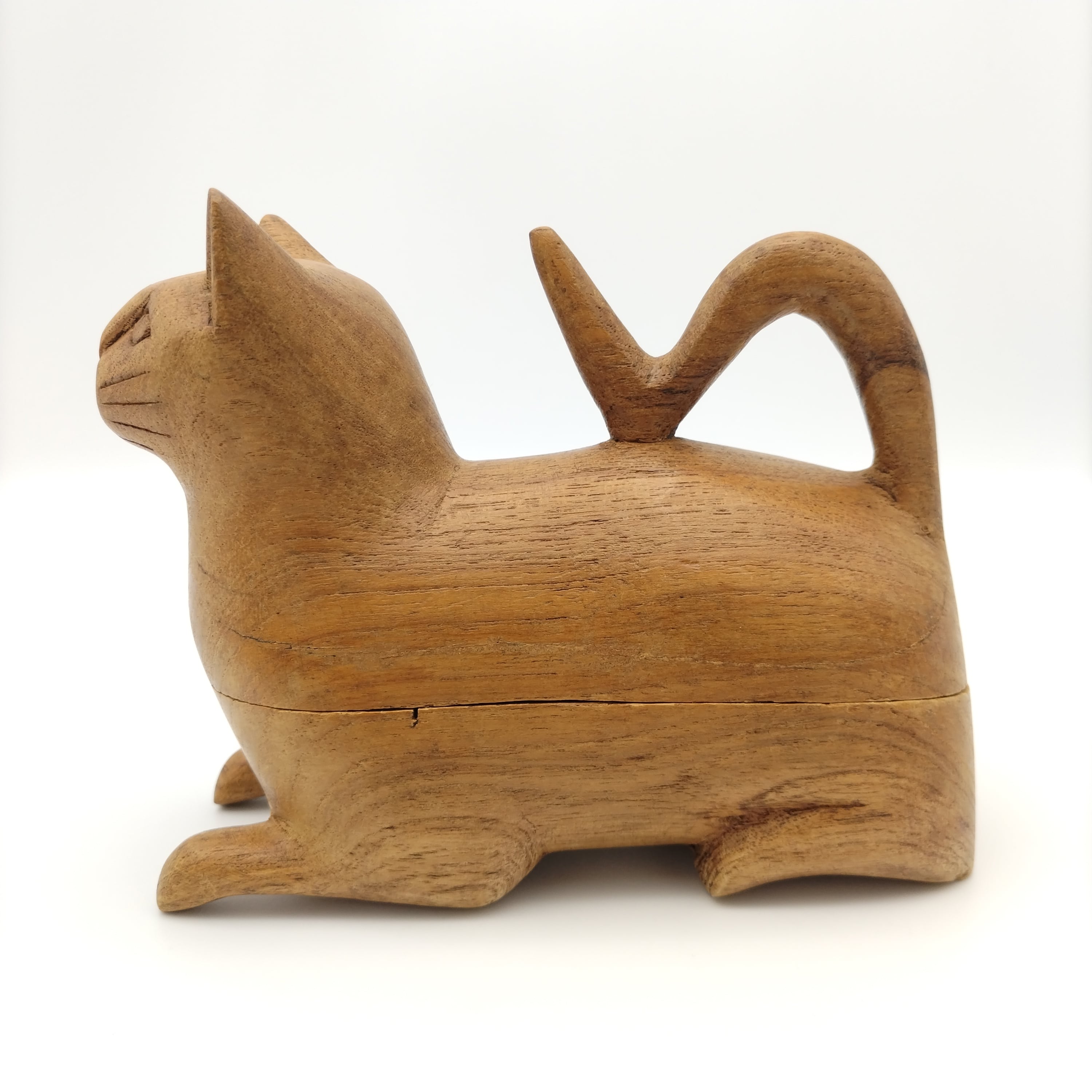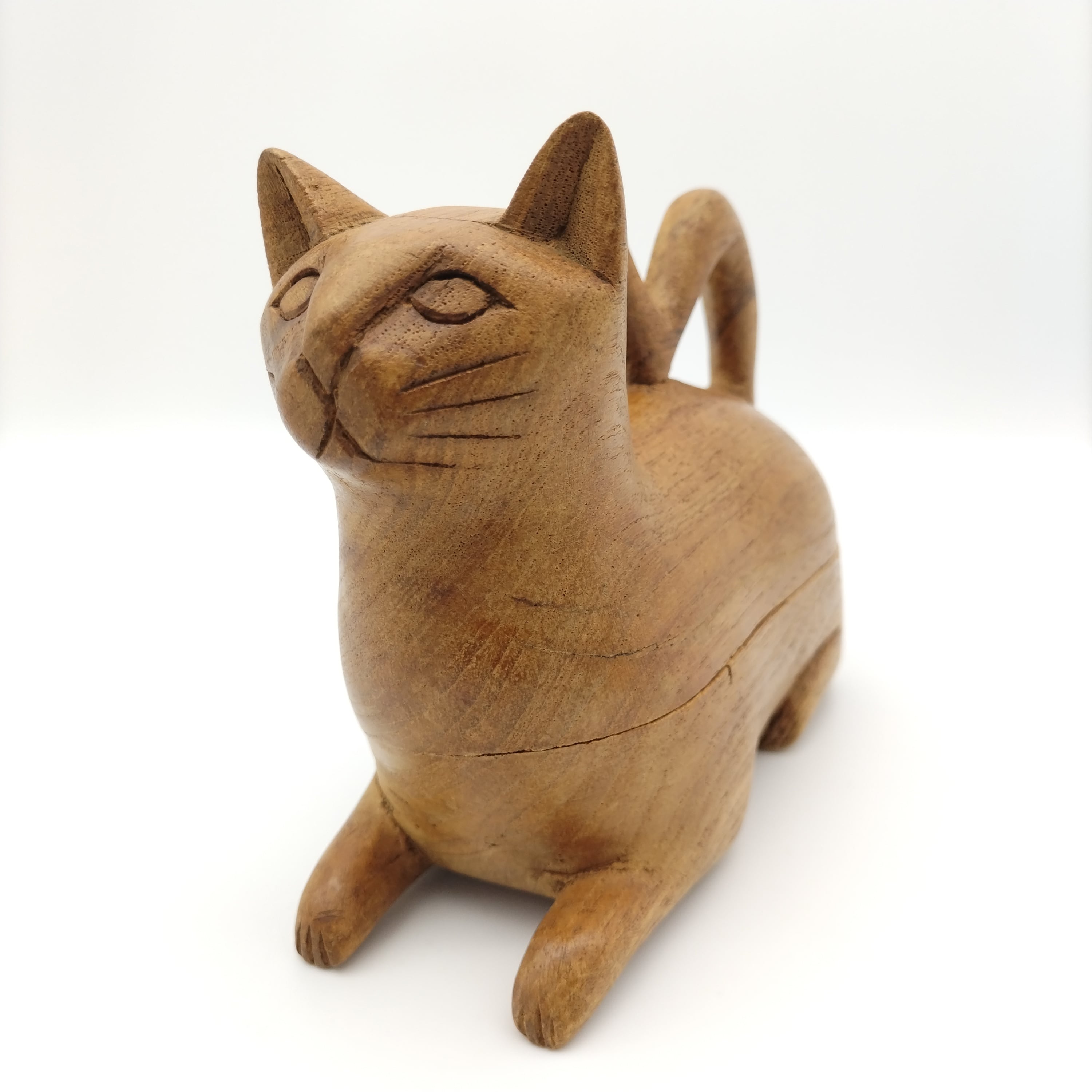 座っている猫の形をしている置物です。手作りの温かみをものすごく感じる斬新な斜めカットで中が小さなBOXになっています。